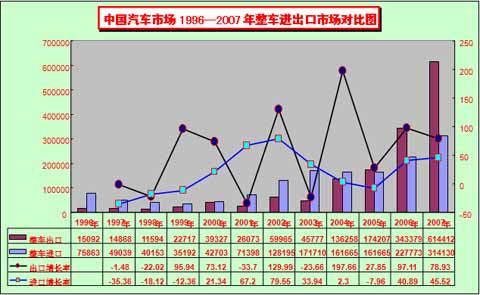 1. 2007年,中國汽車市場出口市場增長率再顯“高速態(tài)勢”;整車出口繼續(xù)保持了持續(xù)性“順差”:貿(mào)易量“順差”30282輛,貿(mào)易額“逆差”3698021808美元;商用汽車市場出口市場,整車出口繼續(xù)保持了持續(xù)性“順差”:貿(mào)易量“順差”337877輛,貿(mào)易額“順差”40435100230美元。