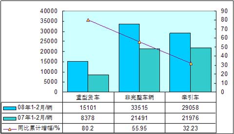 圖1:重卡各類車型08年1-2月的累計(jì)銷量及同比增幅