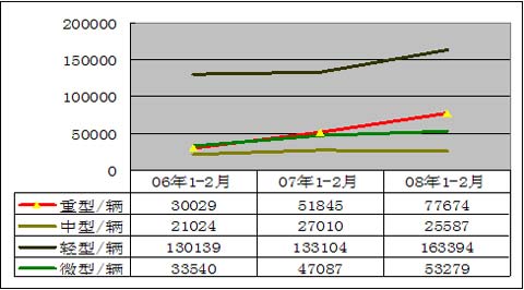 統(tǒng)計(jì)數(shù)據(jù)顯示,全國各類卡車——重型、中型、輕型、微型,08年1-2月的合計(jì)銷售總量為319934輛,同比增長23.50%。在這樣的背景下,重卡出現(xiàn)了大幅增長的態(tài)勢,增幅為49.82%。數(shù)據(jù)分析表明,這一增幅與去年同期相比,有所減弱——07年1-2月的同比增幅為72.65%。