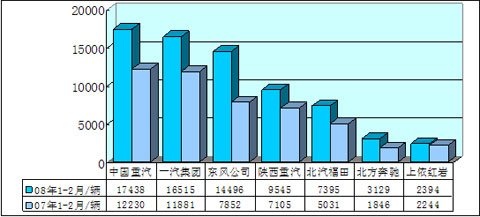 最后兩名位次的變化是,北方奔馳以3129輛的業(yè)績超過上汽依維柯紅巖獲得第6名,上汽依維柯紅巖落為第7,銷量為2394輛。主流商用車企業(yè)08年1-2月重卡銷量與去年同期的對比情況如圖4所示。