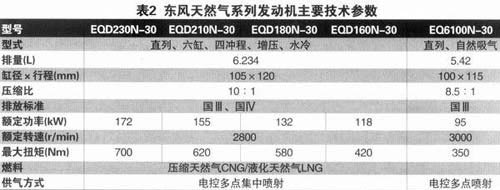 東風(fēng)公司曾承擔(dān)國家科技部“十五”國家科技攻關(guān)計(jì)劃項(xiàng)目中的電控噴射單燃料CNG公交客車發(fā)動(dòng)機(jī)的研究開發(fā)項(xiàng)目,其開發(fā)的EQDN系列單一燃料電控天然氣發(fā)動(dòng)機(jī),獲得良好的動(dòng)力性與經(jīng)濟(jì)性,能滿足國Ⅲ以上排放要求。2004~2007年,在CNG發(fā)動(dòng)機(jī)的基礎(chǔ)上又開發(fā)了LNG發(fā)動(dòng)機(jī),現(xiàn)在市場上被大量應(yīng)用。同時(shí),隨著排放法規(guī)要求的日益嚴(yán)格,該廠對EQDN系列電控國IV以上機(jī)型進(jìn)行的開發(fā)獲重大進(jìn)展(見表2)。