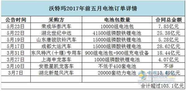 在2017年5月17-23日的一周時(shí)間里,深圳市沃特瑪電池有限公司(下稱(chēng)“沃特瑪”)簽訂了4大訂單,訂單金額超過(guò)67.11億元。