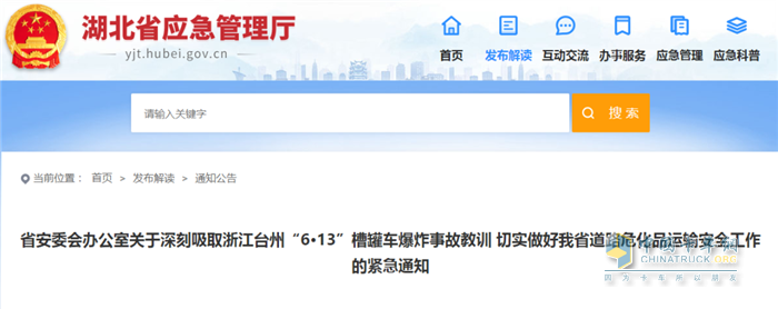 為深刻吸取浙江臺州“6·13”槽罐車爆炸事故教訓(xùn),舉一反三,認(rèn)真做好湖北省道路危化品運(yùn)輸安全工作,現(xiàn)就有關(guān)要求緊急通知如下: