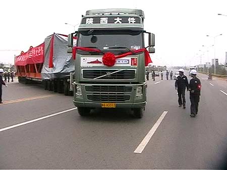 為保證順利完成此次運輸任務,陜西大件運輸公司選擇以安全和科技性能著稱沃爾沃重卡為主力,組建了由大小14輛汽車組成的大型車隊,9月24日由武漢浩蕩起程,運至中原大省-河南。ㄠ嵵荩。途中時速30公里/小時,每50公里檢查一次車輛運輸狀態(tài),行程500余公里,晝夜兼程,26日抵達鄭州。
