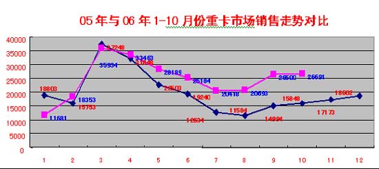 2006年?duì)恳囀袌?chǎng)是重卡市場(chǎng)一大亮點(diǎn),10月份牽引車?yán)^續(xù)亮點(diǎn)重卡市場(chǎng),銷量繼續(xù)高走。1—10月份牽引車整體市場(chǎng)銷量726365輛,較去年同期(46846輛)增長(zhǎng)率55.05%,完全走出了05年的牽引車市場(chǎng)的“噩夢(mèng)期”。重卡行業(yè)前六甲中,大部分企業(yè)處于景氣狀態(tài)。