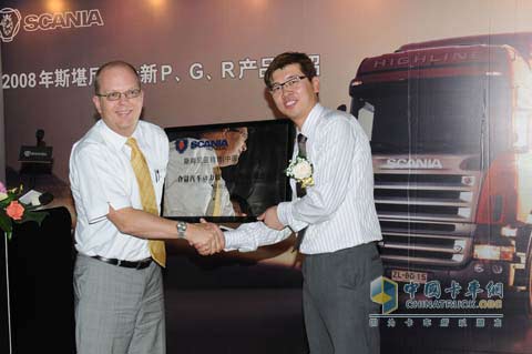斯堪尼亞銷售中國總經(jīng)理何墨池先生向合益汽車動力服務(wù)總經(jīng)理許智仁先生授牌