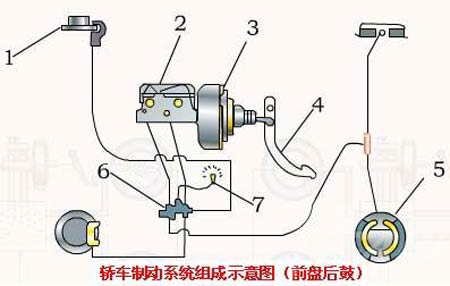 1、前輪盤式制動(dòng)器 2、制動(dòng)總泵 3、真空助力器 4、制動(dòng)踏板機(jī)構(gòu) 5、后輪鼓式制動(dòng)器 6、制動(dòng)組合閥 7、制動(dòng)警示燈