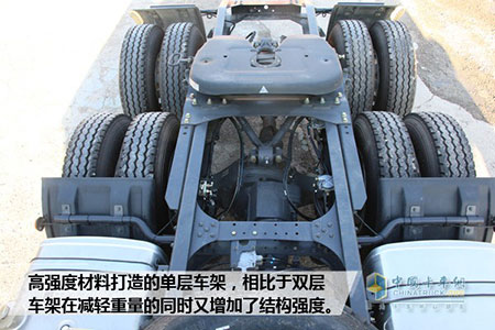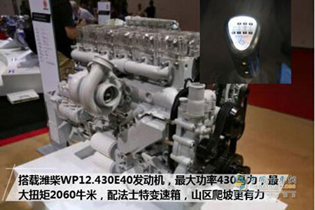 本次試駕的車輛搭載一款濰柴WP12.430E40發(fā)動機,與之相匹配的是一款法士特12檔變速箱,發(fā)動機最大功率430馬力,最大扭矩2060牛米,充足的動力輸出有助與車輛在重載情況下的起步。
