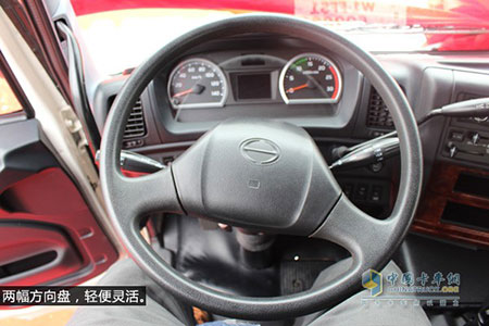 再來看一下方向盤,也是很有特點的,沒有使用市場上主流的四副方向盤,而是采用了兩幅,老司機們都明白,兩幅其實已經夠用了,方向盤幾幅對駕駛時的影響并不大,兩幅方向盤反而顯得更加輕便靈活。