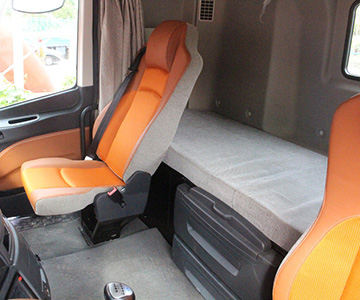 駕駛室采用四點懸浮式,能有效降低來自路面的震動,提高了駕駛舒適性。采用的是高頂平地板駕駛室,同時內(nèi)飾色彩相比GTL比較豐富。采用四輻式多功能方向盤,集成了車載多媒體等功能按鍵,布局合理清晰。同時方向盤材質(zhì)考究,手感極佳。中控臺面向駕駛員,功能齊全,操作方便,并且還配備了自動空調(diào)。EST儲物空間比較豐富,高頂儲物柜、臥鋪兩側(cè)的儲物格、以及臥鋪下方的儲物柜,能滿足司機(jī)放置物品的需求。EST內(nèi)飾方面人性化設(shè)計十足,天窗帶防蟲網(wǎng)、歇腳墊、臥鋪下方儲物柜配有小桌板,以及一個220V的電源插口。