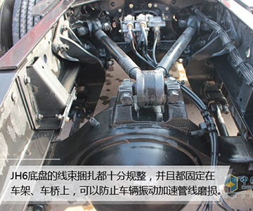 JH6的發(fā)動機、變速箱、后橋全部實現(xiàn)了10萬公里保養(yǎng),同時整車還采用了美國康邁的油潤滑輪端,最長可達50萬公里保養(yǎng)里程,可以通過軸頭的透明觀察窗來檢查輪端內(nèi)的潤滑油質(zhì)量,十分人性化??梢钥吹絁H6的鋁合金油箱占據(jù)了車架右邊所有的空間,其容積可達800L,擁有十分出色的續(xù)航里程,不愧高端長途物流運輸車之名。在其他細節(jié)方面,JH6底盤的線束捆扎都十分規(guī)整,并且都固定在了車架和車橋上,這樣可以防止車輛振動加速管線磨損,可見解放在這方面的用心。