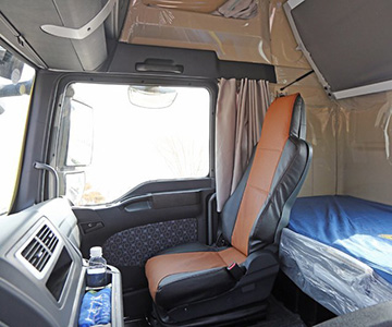 駕駛室內(nèi)部顏色主要以黑色為主,帶有多角度可調(diào)節(jié)氣囊座椅,帶有腰部支撐,雙座椅扶手。整體的中控布局算得上是十分大氣,再加平地板設計,駕駛員活動時分自由,顯得駕駛室更加高端。該車采用四幅式多功能方向盤,集成了多媒體控制以及定速巡航控制。中控臺功能按鍵比較多,包含了行車記錄,SOS一鍵救援、自動空調(diào)、燈光等功能。儀表臺中部為空調(diào)出風口及多個儲物盒,駕駛室頂部為三大兩小儲物格,,完全滿足司機放置物品的需求,車內(nèi)照明燈也布置在中間儲物箱下方。駕駛室上方配有手動天窗,能夠保證駕駛室內(nèi)的空氣流通。