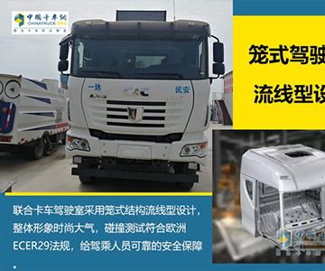 聯(lián)合卡車LNG智能環(huán)保渣土車駕駛室采用籠式結(jié)構(gòu)流線型設(shè)計(jì),整體形象時(shí)尚大氣,碰撞測(cè)試符合歐洲ECER29法規(guī),給駕乘人員可靠的安全保障。大間距進(jìn)氣柵格,配合盾形標(biāo)志非常漂亮,識(shí)別度強(qiáng),U平臺(tái)匹配寬體駕駛室內(nèi)部空間更加開闊。最為人性化的設(shè)計(jì)莫過于在前車臉下邊增加了一個(gè)補(bǔ)光燈,是渣土車駕駛員在夜間作業(yè)更為安全。最后車頂?shù)奈恢眠€增加了遮光板。
