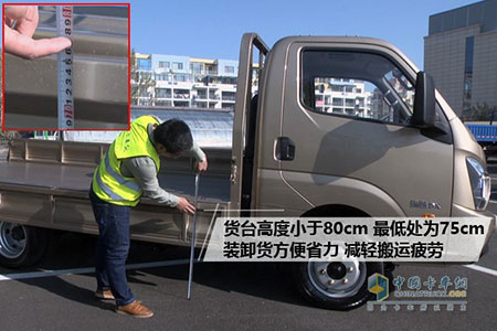 締途整車設(shè)計(jì)另一大優(yōu)勢在于貨箱高度的調(diào)整,貨臺高度小于80cm,最低處僅為75cm,這對于貨物裝卸者而言,有限減輕搬運(yùn)輕度,方便快捷。