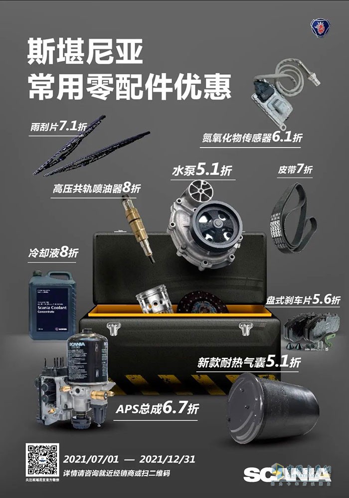 零配件優(yōu)惠活動將在2021年7月1日正式上線。此次加入了許多適用于全新一代斯堪尼亞車型的常用零配件,部分零件屬于首次參加促銷,如高壓共軌噴油器、新款耐熱氣囊、冷卻液等等,折扣力度前所未有,真正做到為廣大客戶車輛的日常維護(hù)工作“減負(fù)”。