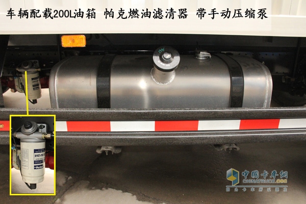 200L鋁合金油箱,符合城市物流要求。裝有高品質的帕克燃油濾清器,帶有水位傳感器和手動壓縮泵。
