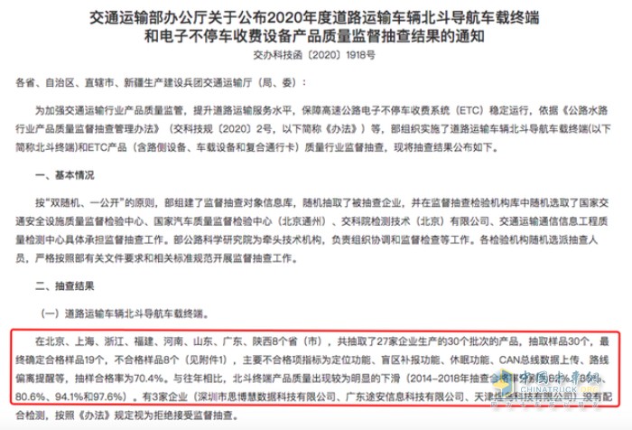 北斗導(dǎo)航是用來進(jìn)行車輛定位的,車輛在出廠時(shí)安裝的記錄儀并不是北斗公司自己的產(chǎn)品,而全國北斗記錄儀生產(chǎn)廠商數(shù)量龐大,質(zhì)量也參差不齊,根據(jù)去年交通部的抽檢結(jié)果顯示,北斗導(dǎo)航記錄儀的合格率只有70.4%,這也在無形中增加了記錄儀的故障發(fā)生率。