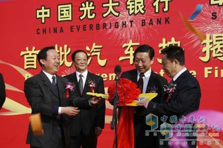 中國光大銀行總行公司業(yè)務(wù)部總經(jīng)理閆桂軍、中國重汽副總裁韋志海出席交車儀式。