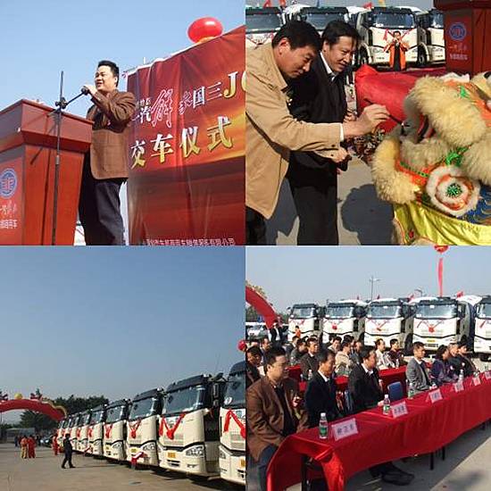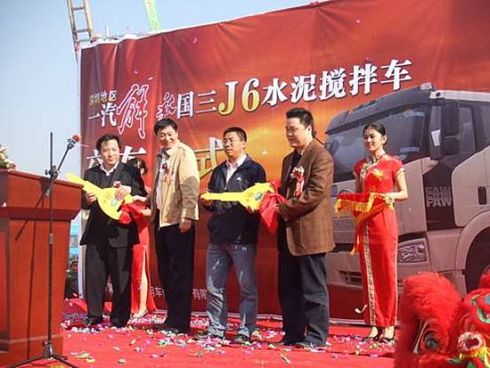 09年元月5號,10輛解放國IIIJ6水泥攪拌車交車儀式在深圳東都商用車銷售服務有限公司4S店外廣場隆重舉行。此次活動受到各級領導的高度重視,一汽貿易總公司華南分公司總監(jiān)陳健先生、天地集團副總經理展海波先生、東都商用車總經理鐘衛(wèi)東先生等領導出席并致辭。