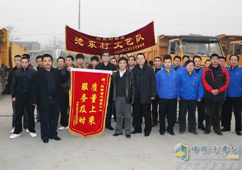 牛年伊始,陜汽公司便陸續(xù)接到了來自用戶的“新年禮物”--錦旗、感謝信、牌匾。有句廣告語說得好:“用戶說好才是真好”,這應(yīng)該就是陜汽牛年的好兆頭。2月7日,四輛陜汽生產(chǎn)的黃色奧龍重型自卸車突然停在了陜汽集團(tuán)北郊新基地銷售公司4S店大門口前,并從車上下來四五十人……到底發(fā)生了什么事?來了這么多車,這么多人,把大門都堵了。隨后只聽鑼鼓聲和鞭炮齊鳴。離大門最近的銷司客服中心的員工們急忙出來探個究竟,銷售公司總經(jīng)理支保京、副總經(jīng)理符儀喆、客服中心經(jīng)理王立寧也都急忙從樓里迎了出來。經(jīng)過一陣寒暄,原來是喜事臨門——西安大唐土方開發(fā)運(yùn)輸公司田利明帶領(lǐng)著運(yùn)輸公司的成員來陜汽客服中心送感謝信和錦旗,感謝陜汽的好產(chǎn)品和優(yōu)質(zhì)服務(wù)讓他走上致富路。