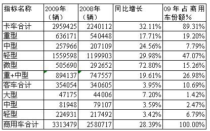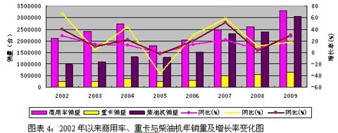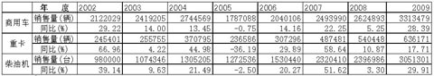 由于柴油機(jī)得天獨(dú)厚的節(jié)油性能、優(yōu)良的可靠性和比汽油機(jī)幾乎長一倍的使用壽命,故在重、中型卡車上幾乎全部采用柴油機(jī),在輕型卡車和客車上也多半采用柴油機(jī)。因此在商用車行業(yè)有句名言,“贏柴油機(jī)者贏天下”。2009年,在政府經(jīng)濟(jì)刺激政策和《汽車產(chǎn)業(yè)調(diào)整和振興規(guī)劃 》出臺(tái)等多重利好因素的帶動(dòng)下,中國汽車市場(chǎng)出現(xiàn)了46.15%的銷量暴漲,并首次超越美國成為世界第一大汽車產(chǎn)銷國。商用車銷量也一舉突破300萬輛大關(guān),實(shí)際銷售331.35萬輛,同比增長28.39%,其中卡車銷售295.94萬輛,同比大幅增長32.11%。在商用車特別是卡車市場(chǎng)的帶動(dòng)下,中國柴油機(jī)市場(chǎng)也出現(xiàn)了大幅增長,據(jù)中國汽車工業(yè)協(xié)會(huì)統(tǒng)計(jì),2009年我國車用柴油機(jī)銷量達(dá)到305.13萬臺(tái),同比增長29.91%。