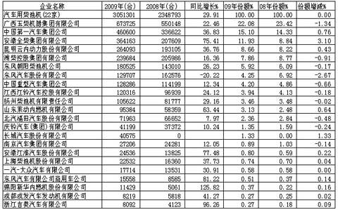 圖表10:2009年中國車用柴油機(jī)22家生產(chǎn)企業(yè)銷量及市場(chǎng)份額增減狀況