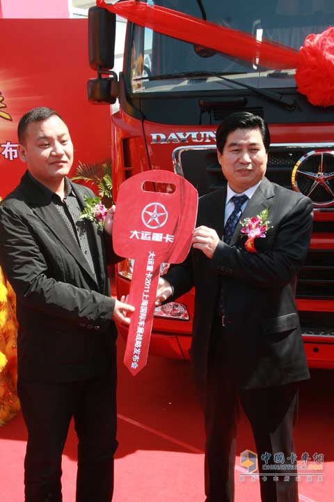 新車發(fā)布儀式現(xiàn)場(chǎng),大運(yùn)集團(tuán)董事長(zhǎng)遠(yuǎn)勤山還為車展第一量卡車購(gòu)買用戶交付鑰匙,并預(yù)祝車主在使用大運(yùn)產(chǎn)品的同時(shí)加速邁進(jìn)致富之路。