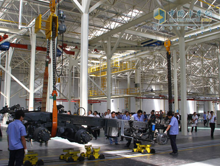 北奔重卡五萬輛總裝生產(chǎn)新線項(xiàng)目位于包頭裝備制造產(chǎn)業(yè)園區(qū),項(xiàng)目用地250畝,建筑面積4.8萬平方米,主要包括:總裝車間、檢測(cè)調(diào)試返修車間、公用配套設(shè)施(車間變電所、空壓站、集中供液站)、工藝停車場(chǎng)、及整車成品停放場(chǎng)。工藝布置為一條U型總裝配線,整個(gè)U形線總長(zhǎng)為760米,是目前國(guó)內(nèi)最長(zhǎng)的單線產(chǎn)能達(dá)5萬輛的底盤裝配線,同時(shí)作為國(guó)內(nèi)首家采用車架翻轉(zhuǎn)機(jī)的生產(chǎn)線,其優(yōu)勢(shì)體現(xiàn)為車架在運(yùn)行的過程中能直接完成翻轉(zhuǎn),節(jié)約了生產(chǎn)時(shí)間,提高了生產(chǎn)節(jié)拍?! ?/p>