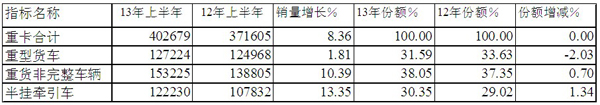 圖表2:2013/2012上半年重卡細(xì)分市場銷售統(tǒng)計(jì)對比(單位:輛)