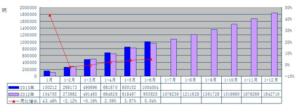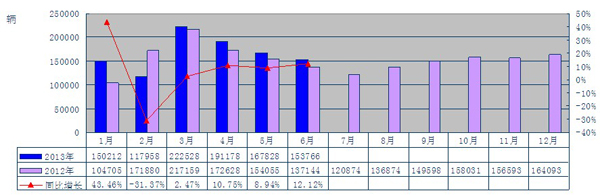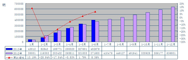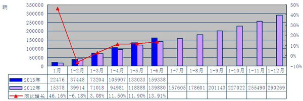 圖表4:2013年上半年重型卡車分月度累計(jì)銷售態(tài)勢