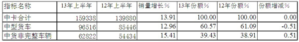 如圖表1,中型卡車是2013年上半年卡車市場四大車型中銷量增幅最大的車型,其市場份額增幅也最大。若再對中型卡車進(jìn)行品種細(xì)分,則其可分為中型貨車(整車)、中型非完整車輛(底盤,如圖表5)。