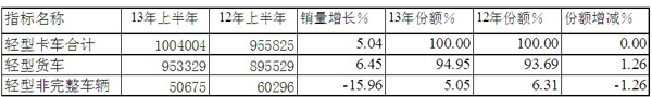 如圖表1,輕型卡車是2013年上半年卡車市場四大細(xì)分車型中反彈幅度較小的車型,增幅僅有5.04%,排名第三,其在卡車中的市場份額比上年同期反而下降了0.42個(gè)百分點(diǎn)。若再對輕型卡車進(jìn)行品種細(xì)分,則其可分為輕型貨車(整車)、輕型非完整車輛(底盤,如圖表8),顯見,輕型非完整車輛的大幅下跌是導(dǎo)致輕卡整體市場增幅微小的主要原因。