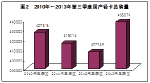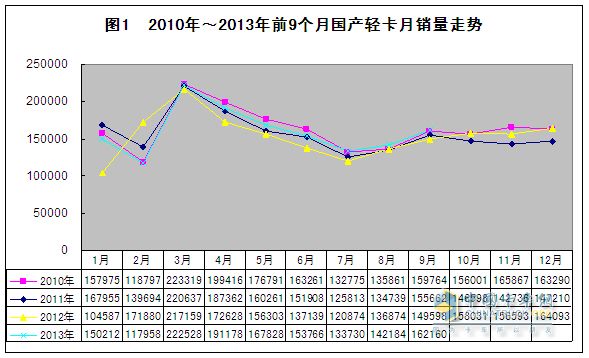 2013年,受輕卡更新高峰期到來,國家相關(guān)部委出臺政策支持小微企業(yè),放開民間投資和貸款利率管制等因素的拉動,國產(chǎn)輕卡7、8、9三個月各月銷量連續(xù)3個月創(chuàng)近4年來同期新高(詳見圖1)。