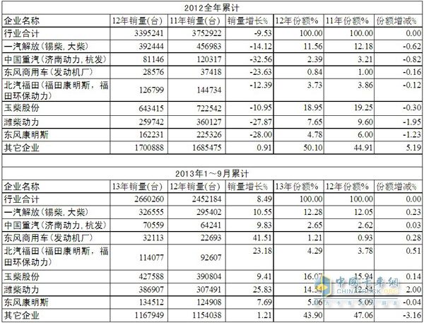 如表3顯見,2012年受國家宏觀環(huán)境影響,重卡市場大幅下降,商用車四強(qiáng)企業(yè)柴油發(fā)動機(jī)銷量也全部下降,其中中國重汽的降幅最大,高達(dá)32.56%。進(jìn)入2013年以來,上半年國家經(jīng)濟(jì)依然在低位徘徊,但第三季度開始卻出現(xiàn)回暖跡象,故重卡市場從6月份開始也呈現(xiàn)迅速回暖勢頭,1~9月份重卡銷量同比大幅增長15.3%。其結(jié)果,帶來整個車用柴油機(jī)行業(yè)企業(yè)普遍回暖,東風(fēng)商用車因?yàn)樽耘涞谋壤谘杆俜糯螅首援a(chǎn)發(fā)動機(jī)呈現(xiàn)41.51%的超高增長;相反,其老配套企業(yè)東風(fēng)康明斯和玉柴的發(fā)動機(jī)銷售則呈現(xiàn)低增長態(tài)勢;一汽解放、中國重汽、北汽福田和濰柴的銷量增幅也都超過了行業(yè)平均水平。