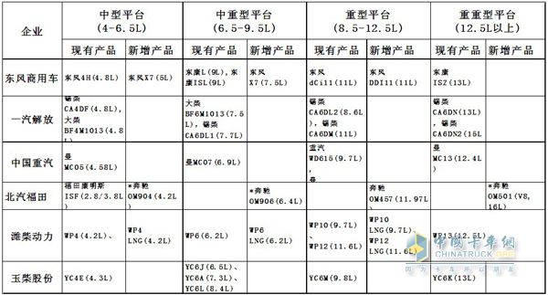 由表4比較顯見,目前在發(fā)動機(jī)平臺布局上,中國重汽、一汽解放兩大整車廠和濰柴、玉柴兩大主機(jī)廠均完成了自己的平臺布局,且在各個平臺上目前均有產(chǎn)品銷售;東風(fēng)商用車則通過與集團(tuán)內(nèi)東風(fēng)康明斯的密切協(xié)作,也已完成平臺布局;北汽福田目前在中重型及以上平臺均沒有產(chǎn)品,但其通過與奔馳的合作,已規(guī)劃了中重型、重型和重重型三大平臺的產(chǎn)品。另由表3還可看出,目前一汽解放和玉柴的發(fā)動機(jī)產(chǎn)品型譜較為豐富,濰柴動力和中國重汽的重型平臺產(chǎn)品也較豐富,而福田的各平臺產(chǎn)品則比較單一。