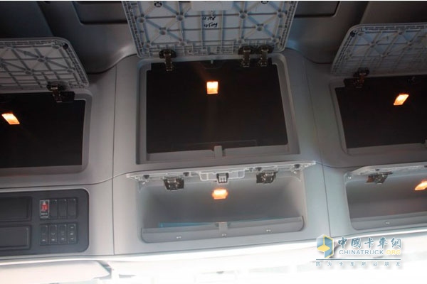駕駛室上方的儲物空間也非常充足,內(nèi)置燈光在打開時會自動接通打開,非常實用