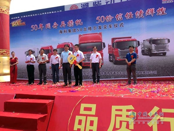 2014年5月22日,正值江淮汽車50周年廠慶之際,江淮格爾發(fā)再發(fā)喜報,江淮格爾發(fā)重卡50臺6×4牽引車交付山東海達(dá)物流有限公司,此次江淮格爾發(fā)交付的重卡車輛主要用于危險品方面的運輸,這也標(biāo)志著江淮格爾發(fā)在危險品運輸?shù)燃?xì)分市場有了更大的突破。
