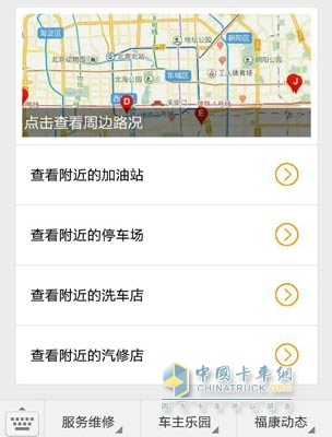 打開福田康明斯微信,能看到共有三個(gè)功能區(qū):服務(wù)維修,車主樂園和福康動(dòng)態(tài)。