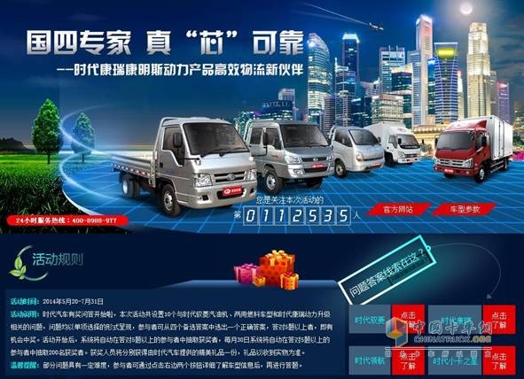 同時(shí),時(shí)代汽車還舉辦了國四產(chǎn)品線上有獎(jiǎng)問答活動(dòng),通過有獎(jiǎng)問答,加強(qiáng)與用戶的互動(dòng),拉近與用戶的距離,同時(shí),在趣味問答的過程中讓用戶對(duì)于時(shí)代汽車國四產(chǎn)品技術(shù)了解的更加深刻。活動(dòng)的推廣吸引了更多的用戶加入到時(shí)代汽車的使用中來。