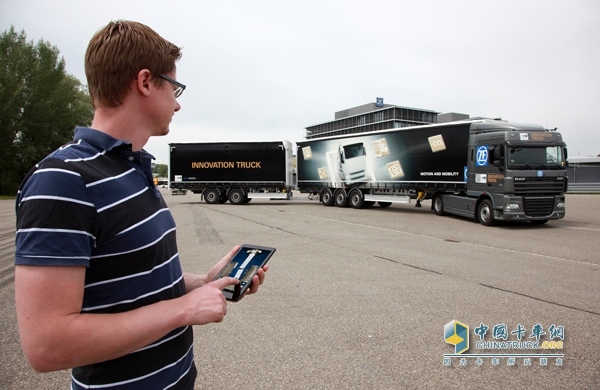 倉庫等待時(shí)間的不確定性是其中一個(gè)主要挑戰(zhàn)。這使得卡車司機(jī)難以遵循其時(shí)間表,并遵守法律對(duì)駕駛、工作和休息時(shí)間的要求。尤其是在斜坡上操控經(jīng)常會(huì)引發(fā)撞擊,從而給車輛造成嚴(yán)重的損壞。特別是EuroCombis(LHVs)——一款面向未來設(shè)計(jì)的約25米長(zhǎng)的牽引式大貨車即便是對(duì)于經(jīng)驗(yàn)豐富的司機(jī)而言都非常難操控:司機(jī)在駕駛座上必須時(shí)刻能夠看到整個(gè)車輛/掛車組的情況,同時(shí)又只能通過前輪轉(zhuǎn)向來精確地操控后部掛車的運(yùn)動(dòng),例如,司機(jī)需要絕對(duì)協(xié)調(diào)好半掛車和掛車的兩個(gè)鉸接角度。采埃孚(ZF)預(yù)研發(fā)和測(cè)試項(xiàng)目經(jīng)理以及創(chuàng)新型卡車的負(fù)責(zé)人OlrikWeinmann談到:“創(chuàng)新型卡車的操控助手完全使司機(jī)從轉(zhuǎn)向和更多工作中解脫出來。他們可以走下卡車,只需動(dòng)動(dòng)手指,通過一個(gè)特殊的平板電腦應(yīng)用程序就可以將牽引式貨車移動(dòng)到合適的位置。”