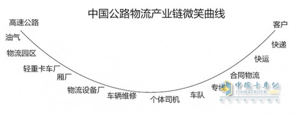 在整個公路物流產(chǎn)業(yè)鏈中,當(dāng)然不同的主體地位差異很大。我畫了下面一個微笑曲線示意圖。這個圖大體描述了各類主體在整個產(chǎn)業(yè)鏈中的話語權(quán)和地位。在微笑曲線兩端的基本日子過得不錯,有些過得相當(dāng)不錯,例如高速、油氣供應(yīng)商、快遞;再往下是物流園區(qū)、卡車廠、快運(yùn)和合同物流企業(yè);居于曲線中間的專線、車隊(duì)、設(shè)備企業(yè)絕大部分日子很難過。