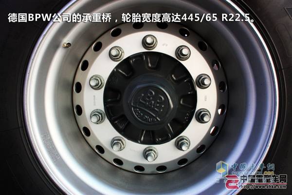 除了驅(qū)動橋采用的是普通尺寸的真空胎,其它車橋都是采用的超寬胎,特別是最后一橋,Paul公司加裝了一根來自德國BPW公司的承重橋,輪胎寬度高達(dá)445/65R22.5。