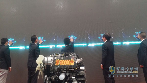 濰柴動(dòng)力副總裁馮剛(右)與江淮汽車集團(tuán)領(lǐng)導(dǎo)為第10000臺(tái)WP3發(fā)動(dòng)機(jī)揭幕