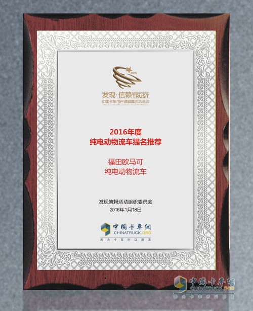 2016年1月18日,“發(fā)現(xiàn)信賴——中國(guó)卡車用戶調(diào)查評(píng)選活動(dòng)”頒獎(jiǎng)典禮在北京舉行,除了評(píng)選出用戶最信賴的卡車及零部件產(chǎn)品之外,中國(guó)最大動(dòng)力電池生產(chǎn)商寧德時(shí)代新能源科技股份有限公司對(duì)于純電動(dòng)物流車發(fā)展高度關(guān)注,贊助的設(shè)置的“2016年度純電動(dòng)物流車提名推薦”引起極大的反響。經(jīng)過(guò)發(fā)現(xiàn)信賴組委會(huì)篩選與審核,福田歐馬可純電動(dòng)物流車以精益品質(zhì)與綠色理念領(lǐng)潮純電動(dòng)物流用車市場(chǎng),成功入圍“2016年度純電動(dòng)物流車提名推薦”。