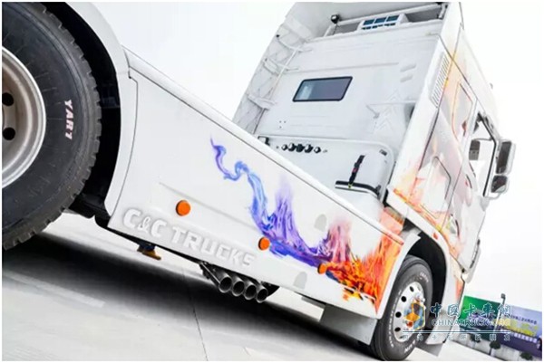 側(cè)裙板噴繪火焰圖案,火焰的顏色從橙紅色漸變?yōu)榍嘧仙笳髦鵂t火純青之意。角落“C&C TRUCKS”增加品牌辨識(shí)度。