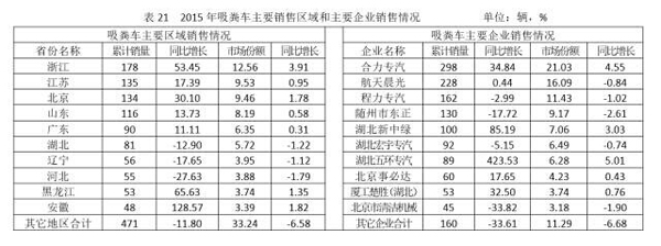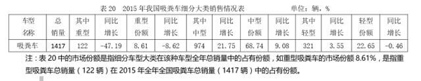 根據(jù)公安部車管所機(jī)動(dòng)車上牌終端數(shù)據(jù),2015年我國(guó)累計(jì)完成吸糞車銷售1417輛,與上年同期(1341輛)相比增長(zhǎng)5.67%;分大類看,中型吸糞車是市場(chǎng)需求的主力車型,全年累計(jì)完成銷售974輛,在2015年全國(guó)吸糞車總銷量(下同)中的占有份額達(dá)68%以上(詳見(jiàn)表20),同比提升9.08個(gè)百分點(diǎn);重型最少,占有份額僅有8.61%。