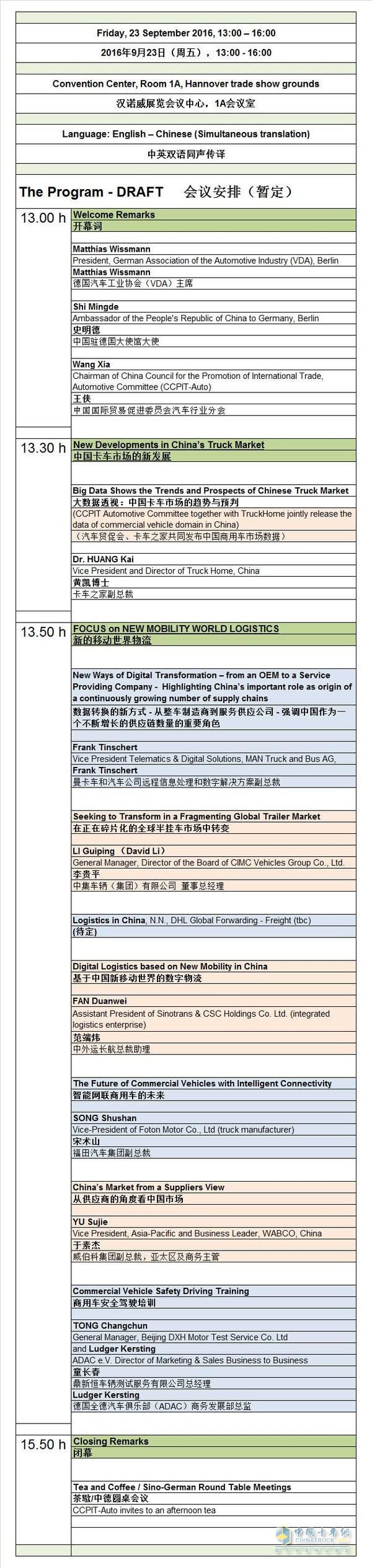 全球最大的商用車展如期而至,第66屆德國漢諾威國際商用車展(2016 IAA),將于今年9月在德國漢諾威舉行,屆時(shí)“中國日”活動(dòng)也將如期舉行,具體日程(最新版)如下:
