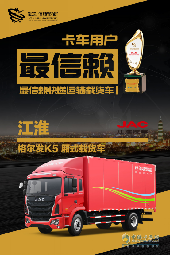 2018年1月18日,由卡車網(wǎng)舉辦的“發(fā)現(xiàn)信賴—中國卡車用戶調(diào)查暨評選活動”在北京圓滿落下帷幕。江淮格爾發(fā)K5快遞載貨車獲得“2018年度中國卡車用戶最信賴載貨車”大獎。