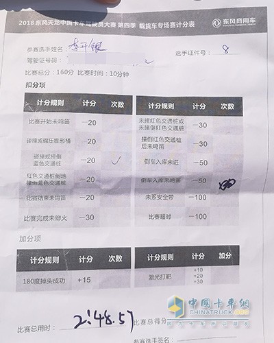 品鑒新產(chǎn)品之時,30余名用戶參加了東風(fēng)天錦KR首席體驗官挑戰(zhàn)賽。據(jù)卡車網(wǎng)記者觀察,本次挑戰(zhàn)賽總分160分,比賽時間上限10分鐘,但會有扣分項與加分項,如果未系安全帶和比賽超時,各會扣掉100分喲,從這一點就可以看出這個比賽對于良好駕駛習(xí)慣的重視,所以選手們的成績才出現(xiàn)了高至195分,低至-10分的分數(shù),落差之大真是看頭不小。比賽現(xiàn)場,雖然是烈日當(dāng)頭,站著都汗流浹背,但參賽選手們,仍然很積極地參加,前八名即使有500元現(xiàn)金獎勵,他們的表現(xiàn)讓記者深感他們并不是純粹是為比賽而來的,更多地是享受全新一代東風(fēng)天錦KR產(chǎn)品帶給他們的舒適駕駛體驗。正如現(xiàn)場李師傅所言:“這車視野好,開著舒服,駕駛室靜音效果好,這天里面那叫一個涼爽”!