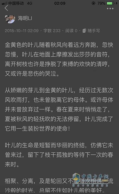 以上是李海明在跑車休息之余所作,從這些文字怎么也看不出他只有小學(xué)五年級(jí)的文憑,這或許是跑運(yùn)輸這么多年,走過(guò)的路,碰到的事情與人,給了他很多創(chuàng)作的素材,再加上自己愛(ài)好文學(xué)的緣故,字里行間透著對(duì)生活的思考,希望他能一直堅(jiān)持下去。